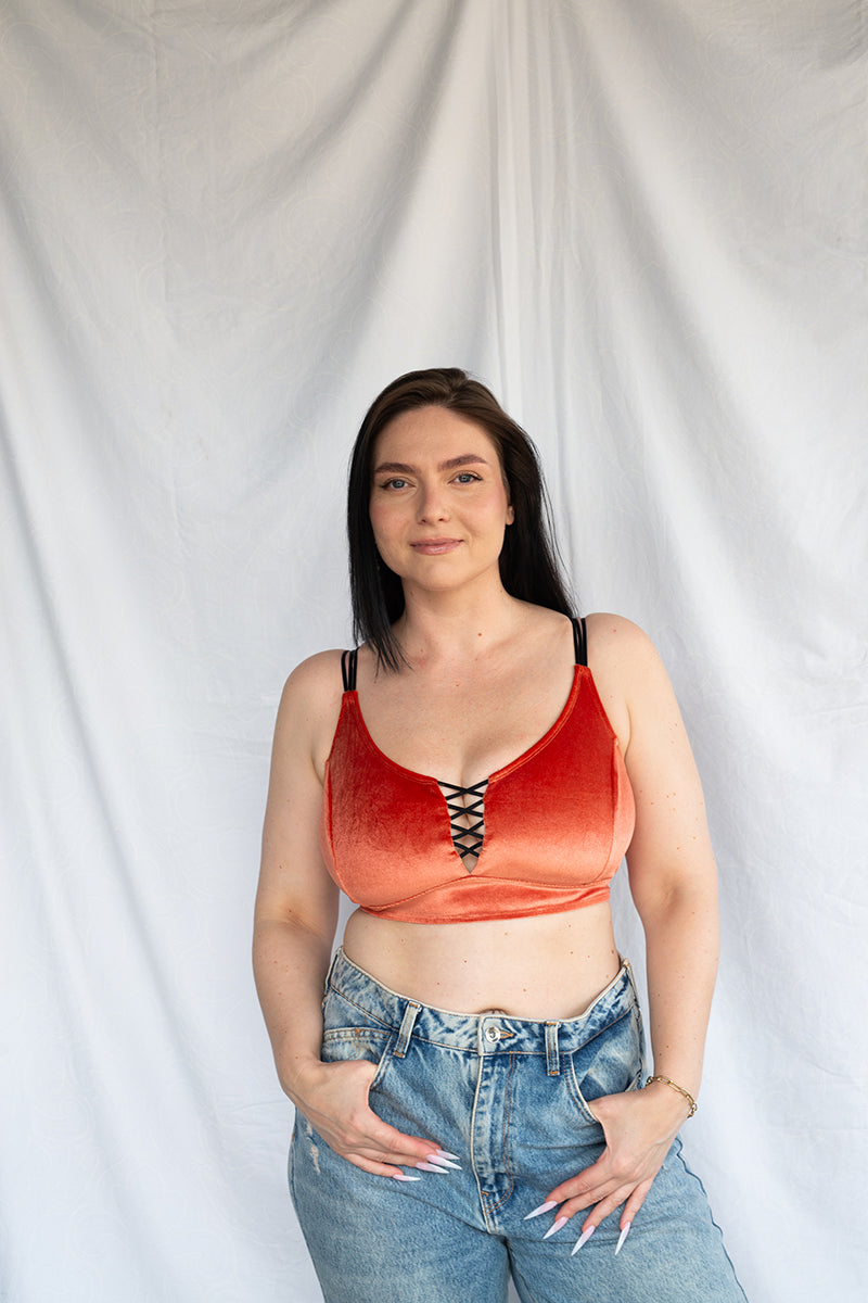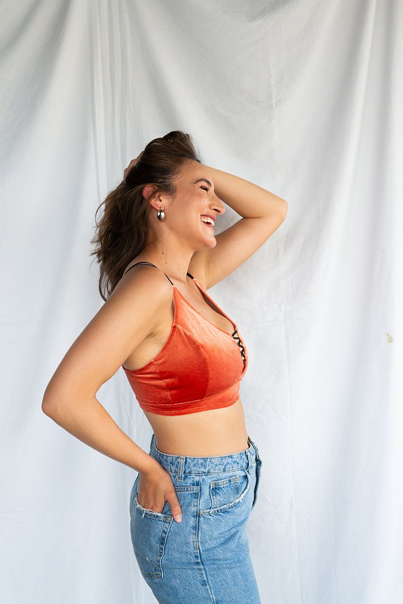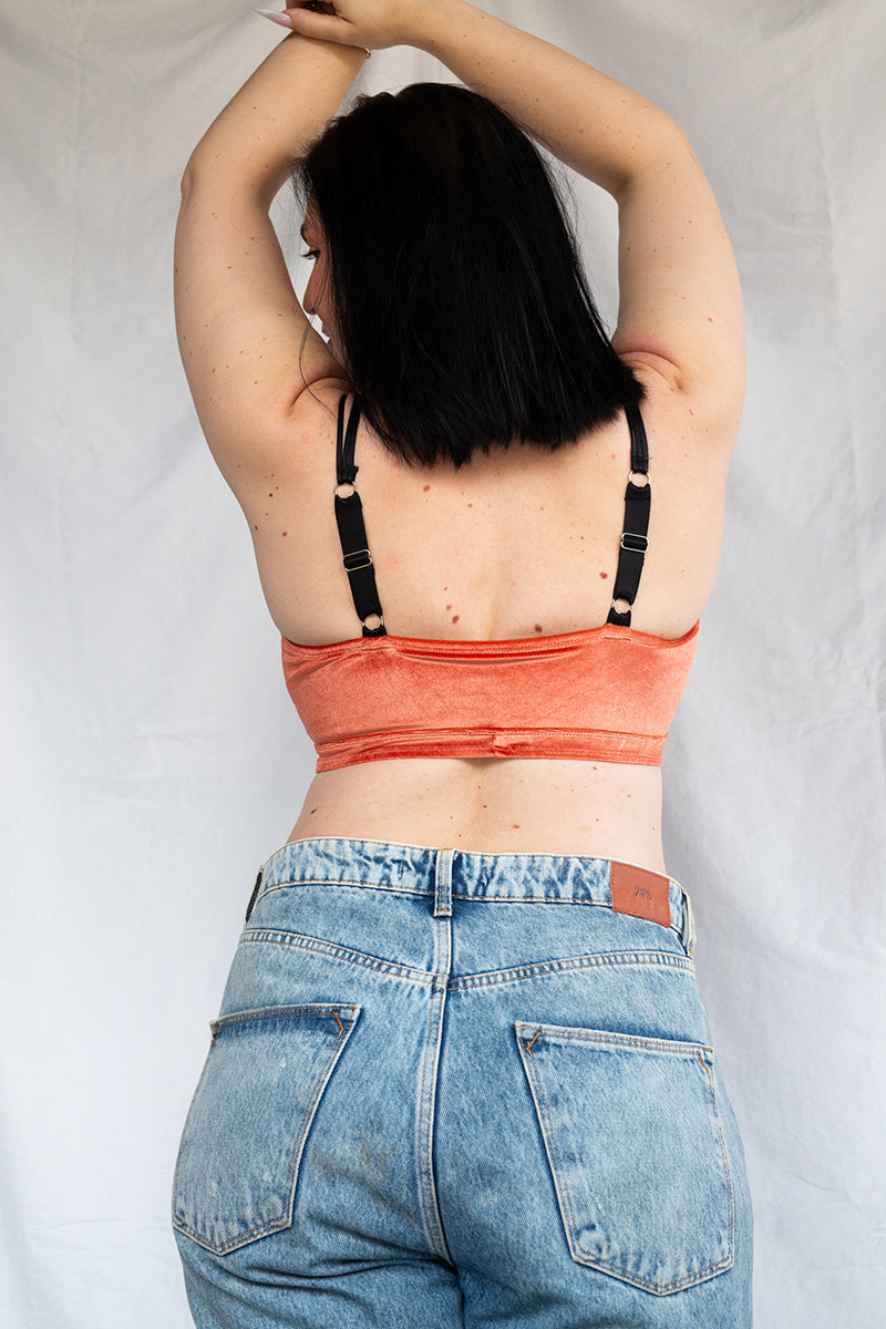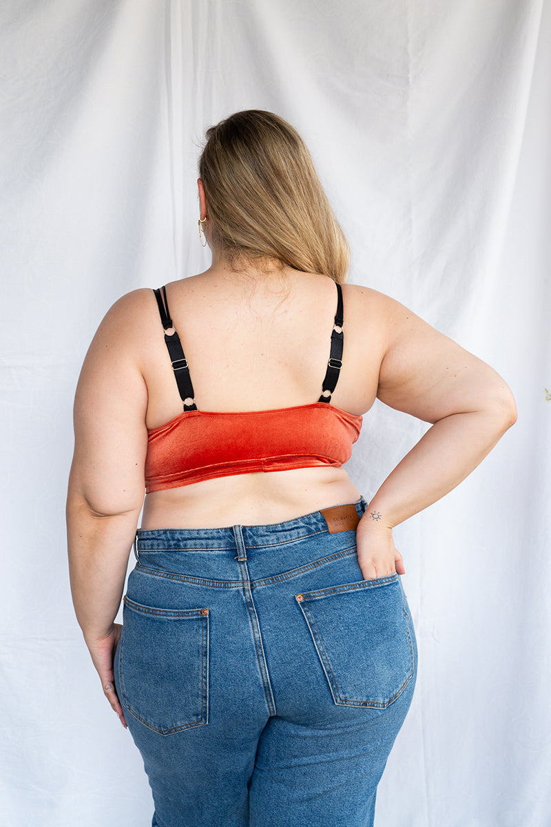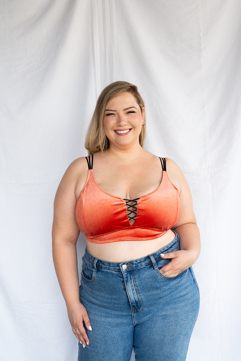 שלושה (!) פסי "ספגטי" יוצרים כתפיות נשיות וסקסיות ועם זאת חזקות, מתכווננות ובלתי מתפשרות. חיתוך גזרה גבוה מתחת לבית השחי אוסף ומכסה את ה"צדדים". הקטיפה כחומר גלם חזק משלבת עוצמה ועדינות ומתאימה למידות גדולות יחסית. טוטאל לוק סקסי, מלכותי ומיוחד. שימי לב שבתכלת החדשה הכתפיות הן בלבן שלג ולא בשחור כפי שצולם